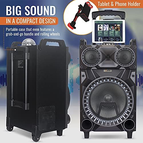 Portable Bluetooth Party Speaker and Karaoke Machine with 2 Wireless Mics, Disco Ball, LED Lights, Handle and Wheels, FM Radio. Loud Party Sound System, Rechargeable Tailgate PA Speaker
