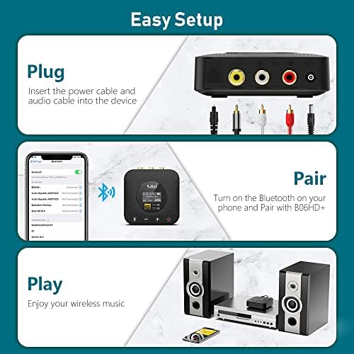 [Plug n Play, Easy Setup] Easily connect most wired home stereo systems or AV receivers via the digital (Optical TOSLINK + SPDIF Coaxial) or analog (L/R RCA) ports. Plug the B06HD+ Bluetooth audio receiver into a power source, pair your Bluetooth enabled smartphone and tablet with a convenient, one-push pairing button.