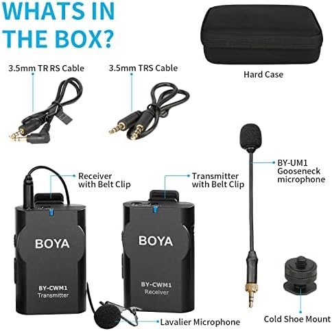 【What You Get】Includes 1*Transmitter,1*Receiver ,1*Lavalier/lapel microphone,1*3.5mm to TRS audio output cable,1*3.5mm to TRRS audio output cable,1* Cold-shoe mount,1*Hard case,1*User Guide,1*BY-UM1 gooseneck microphone
