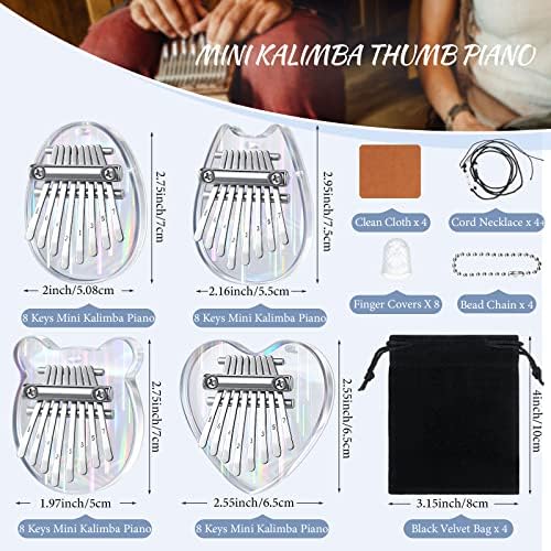 Kalimba Piano Set: you will get 4 pieces of 8 keys mini thumb pianos, 4 pieces of lanyards, 4 pieces of chains, 8 pieces of finger protectors, and 4 pieces of cleaning cloths, enough and complete to meet your daily music needs; These thumb pianos are individually packaged in black bags