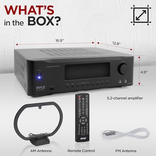 5.2 Channel Receiver System, AV (Audio/Video) Stereo Amplifier, Hi-Fi Home Theater Surround Sound, Built-in Bluetooth Wireless Audio Streaming, Next Gen Audio DSP Sound Processing Technology, 4K Ultra HD TV Pass-Through Support, 3D Video & Blu-Ray Video Pass-Through Support, Digital LCD Display with AM/FM Radio, Connect & Stream Audio from External Devices, MP3 Digital Audio Support, USB Flash Drive Reader, Connection Interface: (3) x HDMI, RCA (L/R), Speaker Binding Posts, Optical / Digital Audio, HDMI Output + Dedicated RCA Subwoofer Output, (2) 1/4’’ -inch Microphone Inputs, Independent Input Source Selection, Digital Graphic Audio Output Level Display, Mic Echo, Bass, Treble, Volume Control Adjustment, Over Current, Short Circuit, and Over Voltage Protection, Simple & Hassle-Free Pairing, Instantly Receives Wireless Music Streaming, Works with all of Today’s Latest Devices, (Smartphones, Tablets, Laptops, Computers, etc.), Bluetooth Version: 4.0, Bluetooth Network Name: ‘PyleUSA’, Wireless Range: 30’+ ft., AV Receiver, Remote Control, AM / FM Radio Antennas, Power Output: 1000 Watt MAX, Amplifier Receiver Type: 5.2-Channel, Speaker Impedance: 4-16 Ohm, S/N Ratio: >80dB, T.H.D.: <0.05%, Radio Station Memory: 30 Presets, DSP/EQ: Live, Hall, Disco, Church, Rock, Jazz, Classic, Digital Audio File Support: MP3 / WMA, Maximum USB Flash Support: Up to 16GB, Battery Operated Remote Control, Requires (2) x ‘AAA’ Batteries, Not Included, Power Cable Length: 3.9’ ft., Power Supply: 120V, Total Unit Dimensions (L x W x H): 16.9’’ x 12.8’’ x 4.9 ’’ -inches, Weight: 18.8 lbs.