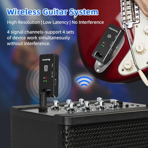 AITONE Wireless Guitar System 2.4 Ghz Guitar Bass Transmitter and Receiver with Battery Case for 6.35mm 3.5mm Mono Audio Electric Music Instruments (WP8)