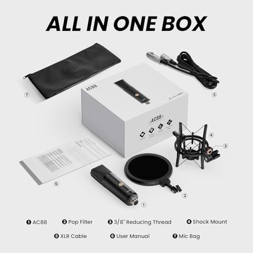 ALABS AC88 XLR Podcast Microphone – Professional Condenser Studio Mic with 25mm Large Diaphragm, Shock Mount, Pop Filter for Streaming, Podcasting, Vocals, and Recording.