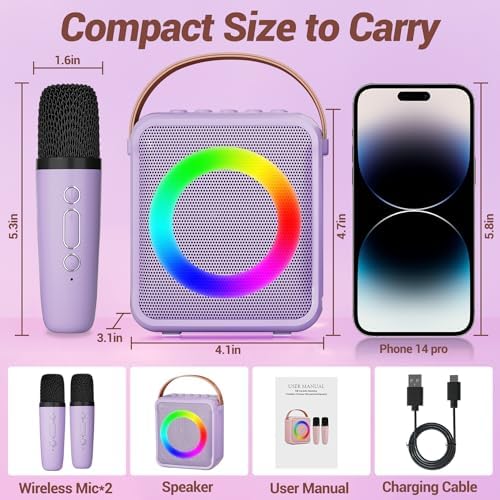 Compact Size And Easy To Carry: The size of the portable speaker is only 4.1*3*4.7 in The diameter of the microphone handle is only 1.4 in Even a 3 year old girl can easily hold it. Any corners of the karaoke machine and microphones are soft and have a smooth surface, making it safe for 4-8 years old girls and boys to use.