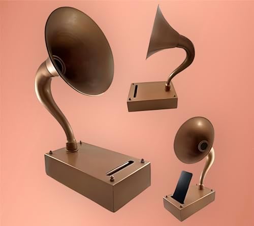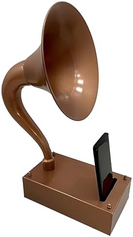 This vintage gramophone is a perfect gift for music lovers. It is made of solid metal and has a Copper Brass finish. The gramophone is non-electrical It’s an old-fashioned gramophone with a Copper Brass Finish. The reproduction phonograph design of this smartphone acoustic speaker is reminiscent of gramophones from the 1920s. This gramophone speaker is an amplifier that operates without electricity. To use it, simply insert your phone into the top phone slot on the base, as seen in the bottom image.