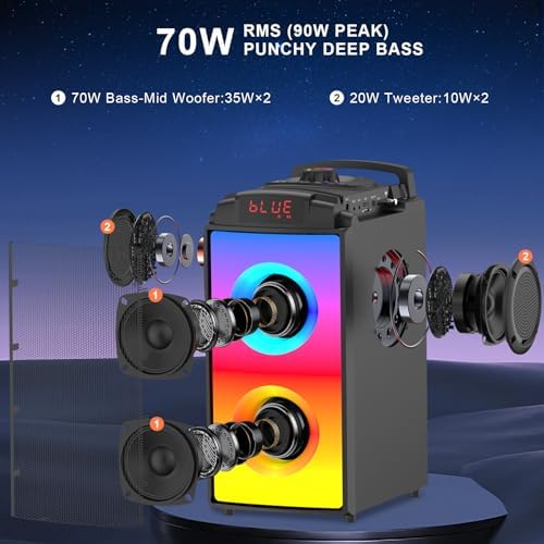 70W Rich Bass Party Speaker — two woofers, two tweeters and and a rear heavy bass guide tube enchance powerful bass.