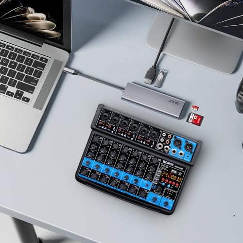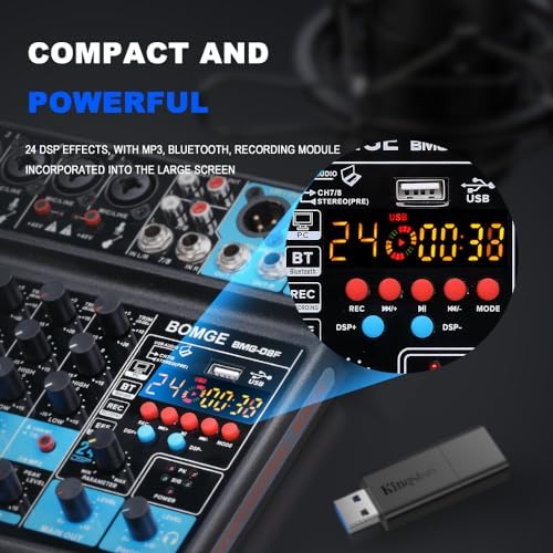 BOMGE 8 channel mini audio mixer Line Mixer,DC 5V,with MP3 Player,Bluetooth,U disk 48V,24DSP effects, USB recording Ideal for Small Clubs or Bars,Studio Recording (8 channels-BLACK)