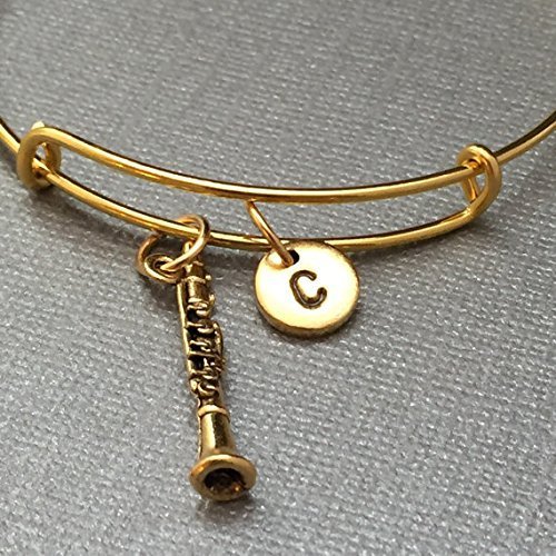 A clarinet charm bangle bracelet with hand stamped initial *Bracelet is adjustable *Initial charm is antique gold pewter 9mm *Clarinet charm is antique gold pewter *Your purchase will arrive packaged in a cute gift box and I will include a message by request.