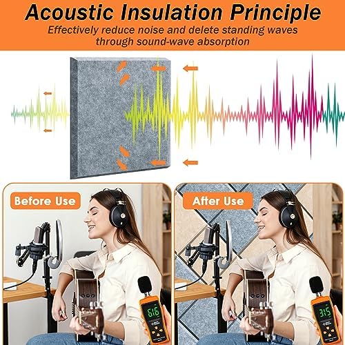 【Cost-Effective Panels for a Better Deal】 Get a better deal with our cost-effective Sound Proof Foam Panels. Made of 100% polyester fiber, they are odorless and harmless, with a high density of 250KG/M3. They have a B1 fire resistance rating and an NRC of 0.92. Each pack contains 12 pieces of wall panels, Size 10″X10″X0.4″, covering approximately 8.33 square feet.