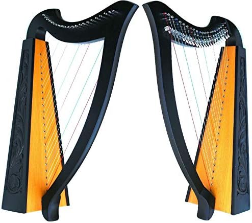 DEURA 22 STRINGS LEVERS BLACK HARP + BAG Irish Celtic Lap Folk MA-1030BK Approximately 33.5″ Diagonal high. Featuring 22 DuPont hard nylon strings, a range from F above Middle C to High C, sharpening levers and has an hand carved Irish knot work Rosewood frame. A Gig BAG tuning tool and an extra string set are included.