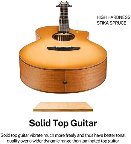[ Solid Stika Spruce Top ] Donner JF shape acoustic guitar is made from Solid Stika Spruce top and A-class Laminated Mahogany back & sides, providing brighter sound and more sufficient resonance, compared with that using plywood as the top.