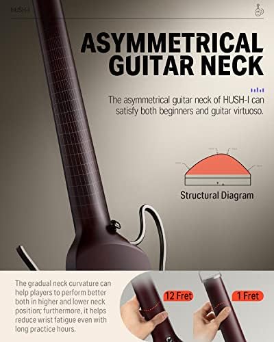 [Make Practice More Comfortable] – The HUSH travel acoustic guitar has an asymmetrical guitar neck, which helps players perform better both in higher and lower neck positions while reducing wrist fatigue during long practice sessions. HUSH-I’s customized round frets are beginner-friendly and help prevent finger cuts during practice.