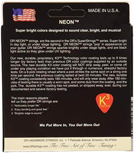 Hi-def neon color coated electric guitar strings are available in a wide variety of luminescent color options Designed to give your stage presence a little extra pop, especially under UV black lighting. They feature a hexagonal core wire and a silver-plated nickel-plated steel wrap on the wound strings. All strings include the neon colored K3 coating, delivering longevity, more projection, fewer unwanted overtones, Plus enhanced clarity and articulation.