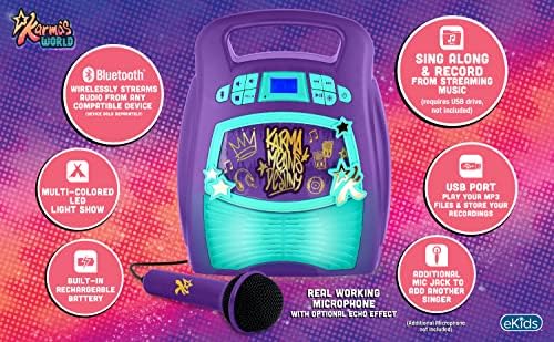 eKids Karmas World Karaoke Machine for Kids, Bluetooth Speaker with Microphone and Karaoke Recorder to Save and Share Performances via USB Port
