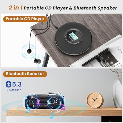 【2 in 1 Multi-functional Portable CD Player & Bluetooth Speaker】Special design with a Bluetooth speaker base, the portable CD player can be used with the equipped Bluetooth speaker via Type-C port, and they can be used separately. The portable CD player built-in rechargeable battery, you can use it with wired headphones, suitable for bringing outside or anywhere. The Bluetooth speaker can be used alone, you can connect it with your phone/tablet when it is in Bluetooth mode.