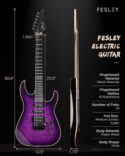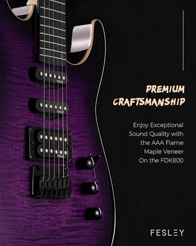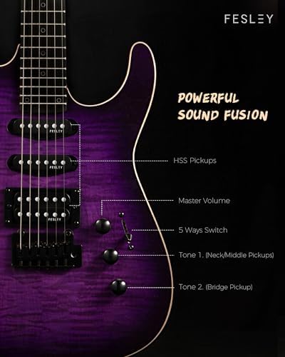 Fesley Electric Guitar, Full Size Solid Body Electric Guitar Beginner Kit, HSS Pickup With Coil Split, Poplar Body Flame Maple Top Maple Neck With Gig Bag, Cable, Strap, Tuner, FDK800, Purple