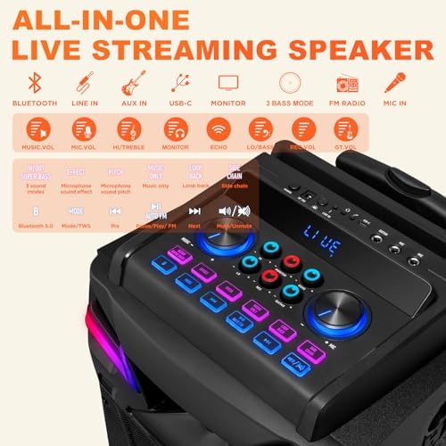 Personalize your broadcasting experience by adjusting microphone volume and audio inputs independently. Choose from 9 microphone effects and enjoy the visual spectacle created by 3 groups of LED art lighting combinations, flashing in sync with the music to create a romantic atmosphere. The control panel features a special luminous button for easy use in low light.