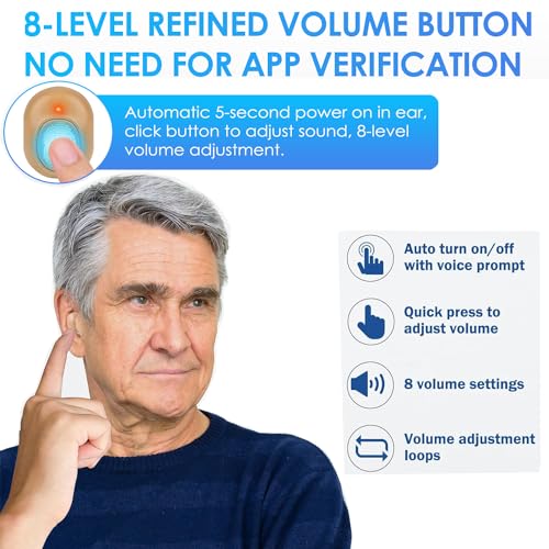 【Simple operation】This hearing aid is small, lightweight, and stylish with no complicated buttons or modes. Just touch the button to turn it on. There are 8 volumes for you to adjust. When changing the volume, just touch your fingerprint. Automatic opening/closing when putting in/taking out the charging case is simple and straightforward, perfect for seniors and easy to use.