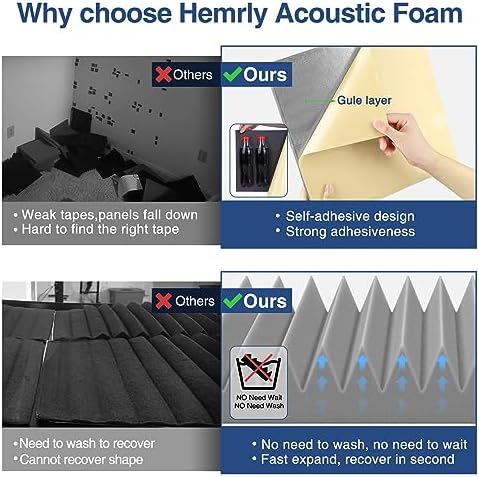 【Upgraded Self- Adhesive】Hemrly soundproof foam are self-adhesive. You don’t need to buy additional spray glue and double-sided tape, tear off the kraft paper on the back and stick it at will. Upgraded durable adhesive holds the soundproof wall panels firmly to the wall. Easy to install without worrying about falling off.