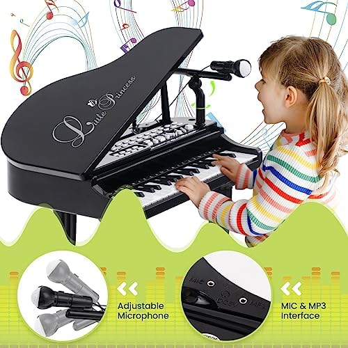 HONEY JOY Classical Kids Piano, 37-Key Toy Mini Grand Piano w/ Music Stand & Stool, Portable Electronic Piano Educational Musical Instrument Toy w/ Microphone, Lights, Gift for Kids (Black, 37 Keys)