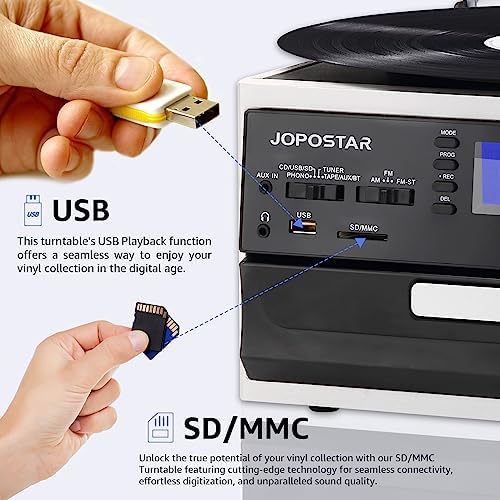 JOPOSTAR 10-in-1 Vinyl Record Player with Bluetooth, 3-Speed Turntable Built-in Stereo Speakers, AM/FM Radio, USB/SD/MMC, CD/Cassette Playback, Aux-in RCA Line-Out