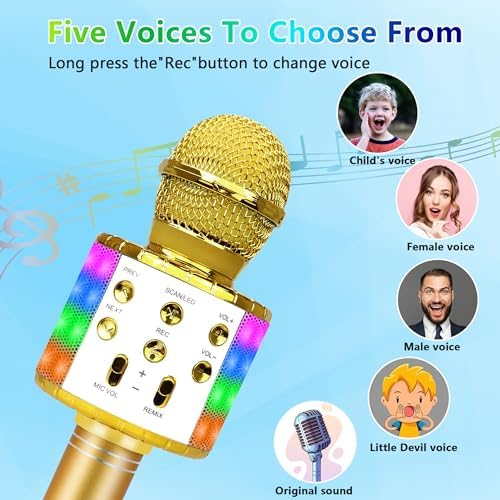 Jvcon Karaoke Microphone for Kids, Wireless Bluetooth Handheld Portable Singing Karaoke Mic Speaker with LED Lights Gift for Girls Boys Kids Children (Gold)