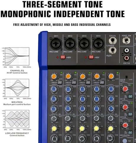 【Durable and Compact Design】Enjoy the high-quality and precise control of our mixer, thanks to the use of high-precision sealed rotary potentiometers and faders. It also has an independent Bluetooth player, MP3 recorder/player, and USB audio interface. The superior sound quality, high performance, and affordability make it perfect for small to medium-sized sound setups and venues.