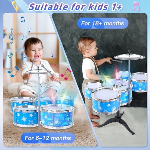 Kids Drum Set for Toddlers w/ Light (All Plastic), Musical Gifts Toys for Boys Girls, Drum Kit Musical Instrument for Beginner Music Practice, Christmas Birthday Gift for Kids