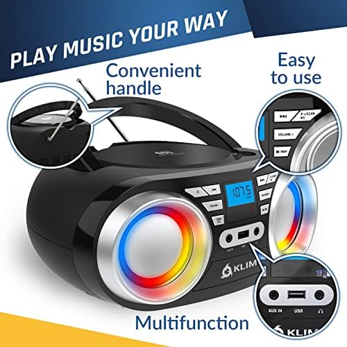 KLIM B3 Portable CD Player – New 2023 – FM Radio CD MP3 Bluetooth AUX USB RGB Lights – CD Boombox – Wired and Wireless Mode with Rechargeable Batteries – Upgraded CD Laser Lens – Digital EQ – Black