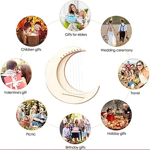 【8/11 String Moon Shape Design】: This string harp is designed with 8/11 strings for higher clarity and resonance, making the sound richer and more complex. At the same time, the moon-shaped design makes it stand out among many harps. The suspended harp strings are designed so that when you gently pluck a string, it will resonate, producing a continuous sound that is warm and pure.