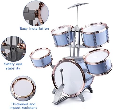 STABLE STRUCTURE & HIGH QUALITY: The sturdy construction of the stool and drum set allows children to sit safely and play the drums happily. The jazz drum kit is made of environmentally friendly plastic material with fine details, light weight but sturdy and reliable. The high-quality design of this beginner drum set produces a clean and loud sound that allows children to play beautiful music, suitable for developing their musical abilities.