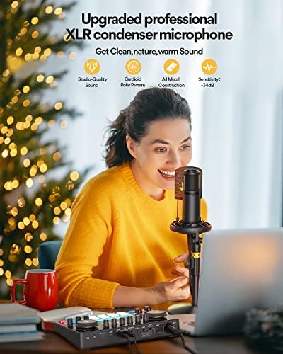 Create a personalized atmosphere with 6 reverb modes, adjustable reverberation time and depth, 12-step automatic adjustment, 3 changeable tones (triple, midrange, bass) and tone change knobs. Each microphone input is controlled independently, and professional features such as side chain, music only and loopback switch are also included. This Christmas, treat yourself to an unforgettable podcasting experience!