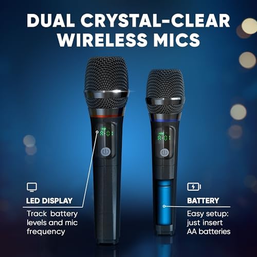 🎤 𝗨𝗡𝗠𝗔𝗧𝗖𝗛𝗘𝗗 𝗪𝗜𝗥𝗘𝗟𝗘𝗦𝗦 𝗠𝗜𝗖𝗥𝗢𝗣𝗛𝗢𝗡𝗘𝗦 – Step up your performance with our wireless microphones, designed for crystal-clear, interference-free audio. Easily powered by AA batteries, they auto-connect to our karaoke machine, ensuring hassle-free setup. Perfect for duets or solo acts, this karaoke system caters to both adults and kids. With dedicated storage on the machine and a strong connection range, it’s the ultimate singing machine experience you’ve been seeking.