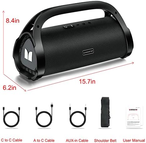 【What You Get】 — Monster Adventurer Max Bluetooth Speaker*1, USB-C charging cable*1, AUX cable*1, Baldric*1, Quick Start Guide*1. If any issues with this speaker, please let us know at anytime, we will figure it out as soon as possible.