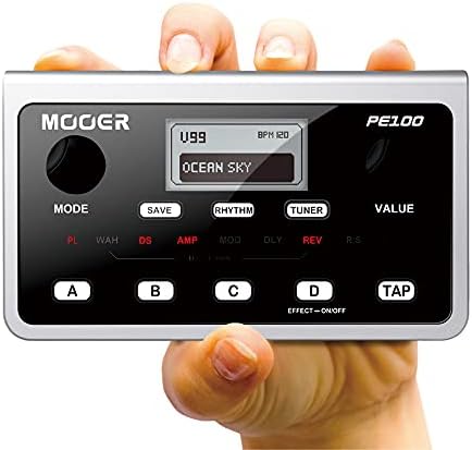 MOOER PE100 Pocket Sized Multi Effects WAH 2 Auto wah effects DS 10 Over drive and distortion effects AMP 7 Amp models MOD 11 Modulation effects DLY 5 Different delays REV 4 Reverb types PL Preset Mode: 98 Factory presets and 99 User presets R.S 40 Drum patterns and 10 metronomes A,B,C,D 4 quick recall preset slots PRESETS 99 Factory presets and 99 user presets