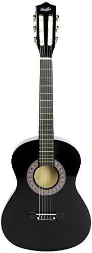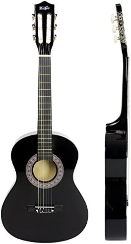 Designed for playability this Music Alley guitar has a host of features that are all designed to benefit the new player, allowing them to avoid the frustrations that prevent the beginner guitar player from progressing. Three-Quarter-Sized Acoustic Guitar: The Music Alley measures 34 inches in length. This and its lightweight linden body makes this, the ideal kid’s guitar or beginner guitar. Acoustic Guitar with Nylon Strings: Softer on the fingers and designed to generate a warm tone the nylon strings featured on this acoustic guitar will take regular tuning until they settle but allow you to play for longer. Acoustic Guitar with Metal Gearheads: The metal gearheads featured on this guitar allow for quicker and more accurate tuning so you can spend less time tuning and more time playing. Acoustic Guitar Accessories: This guitar comes with spare strings and guitar fretboard stickers which will help beginner guitar players learn notes, chords, and scales. Classical Guitar Design: Orginintaing in the 19th century the shape of this guitar has sustained its popularity due to its high playability.