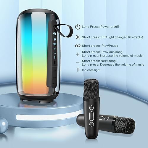 PKSH ICORE Karaoke Machine with Two Wireless Microphones, Portable Bluetooth Speaker with Bass/Treble Adjustment, PA System with Remote Control, LED Lights,Supports TF Card/USB, AUX (Black)