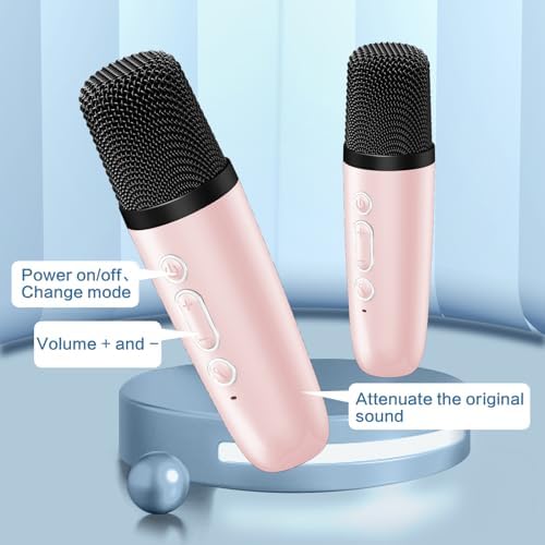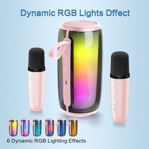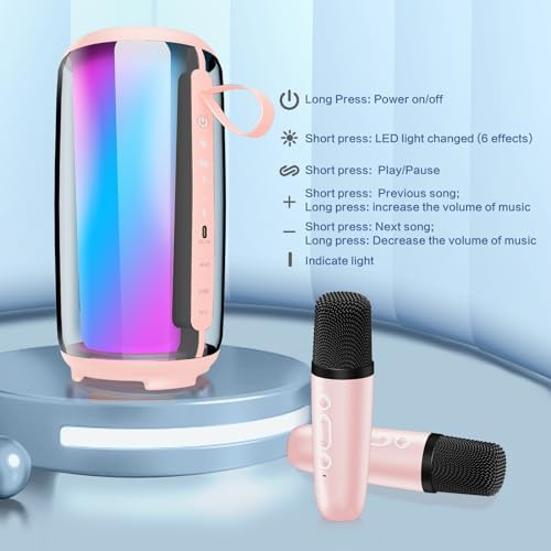 PKSH ICORE Karaoke Machine with Two Wireless Microphones, Portable Bluetooth Speaker with Bass/Treble Adjustment, PA System with Remote Control, LED Lights,Supports TF Card/USB, AUX (Pink)