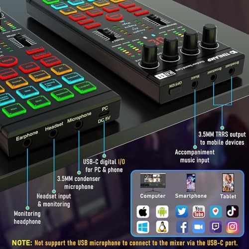 【Wide Compatibility】Audio interface with DJ mixer and sound card works well on computer, laptop, phones, Compatible with iOS, Android, macOS, Windows, 3.5mm input and output interfaces are easy to connect to other devices for audio transmission. Great all-in-one bundle for podcast, live streaming, YouTube, Facebook, Instagram, Tiktok. Start your live streaming when hook it up the smartphone or PC.