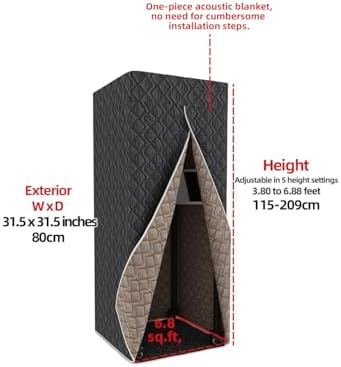 ✅ Spacious and Comfortable Design: Tailored for one to two individuals, our vocal booth provides a cozy recording space. With ample headroom for comfortable standing during recording, it covers an area of 6.88 sq. ft. (31.5 x 31.5 inches). Its five adjustable height settings range from 3.80 to 6.88 feet, accommodating creators of different heights. This adaptability allows easy placement in unique spaces without modifications, ideal for collaborating with band members.