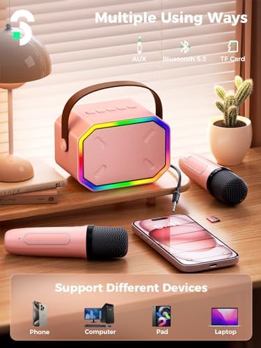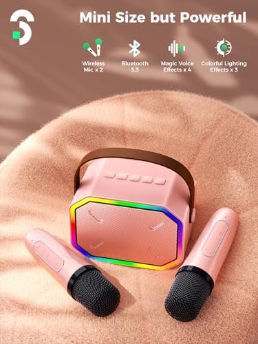 Portable Karaoke Machine for Kids, Bluetooth 5.3 Karaoke Speaker with 2 Wireless Mics, Rechargeable/Colorful LED Lights/Magic Sound, Surprise Gift for Boys Girls Family Home Party Birthday, Pink