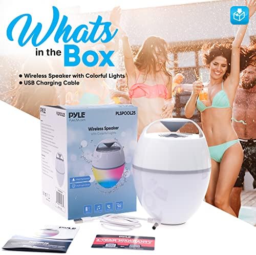 Features: Multi-Colors Lights & Eight Flashing Modes 4 Different LED Lights and 8 Patterns of Flashing Modes Amazing Sound Quality & Louder Volume With High-fidelity Stereo Sound and Passive Radiators Large Battery Capacity & Handsfree Phone Call Built-in Microphone for Personal Handsfree Speakerphone IP68 Waterproof Rating, Shockproof, Dustproof, Scratchproof Speaker Hi-Fi Loud Stereo Sound Long Play Time with Color Changing Light Built-in Rechargeable Battery Wireless Speaker Streaming: Simple & Easy-Free Pairing Works with All of Today’s Latest Devices Smartphones, Tablets, Laptops, Computers, etc. Bluetooth Version: 5.0 Bluetooth Network Name: PYLE Wireless Range: Up to 15-25meters. What’s in the Box: Wireless Speaker with Colorful Lights USB Charging Cable Technical Specs: Power: 6W Construction Material: PC Frequency Response: 2400MHz-2480MHz Battery Life: Up to 30,000+ Hours PA Speaker Battery Type: 3.7V Li-ion – 2500mAh Working Hours: 5-7 Hours Product Dimension: 4.94”x 4.94” x 6.63” -inches Sold as: 1 Weight: 1.5 lbs.