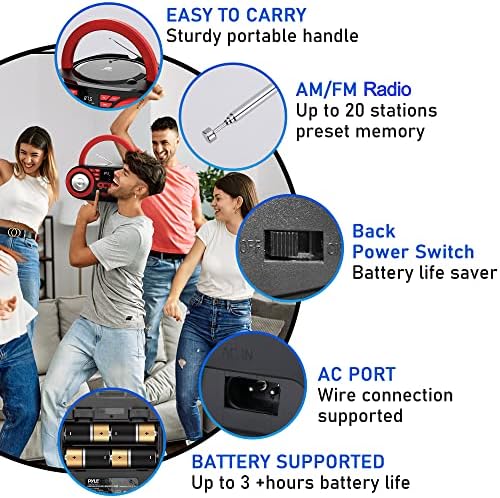 PyleUsa Portable CD Player Bluetooth Boombox Speaker – AM/FM Stereo Radio & Audio Sound, Supports CD-R-RW/MP3/WMA, USB, AUX, Headphone, LED Display, AC/Battery Powered, Red Black – PHCD22