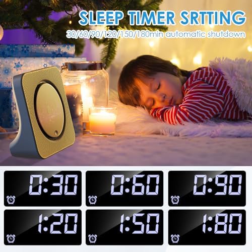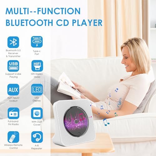 【Portable CD Player with 5 loop playback & Support multi-formats 】 This desktop CD player features 5 playback modes, including Repeat A-B, Repeat one, Repeat all, Shuffle, Normal. It can be set as a sleep timer (Alarm Clock) to stop playing (30-80mintues). The Bluetooth CD Player Supports 5 compatible formats: CD, CD-R, CD-RW, MP3, WMA audio formats, allowing you to freely choose your favorite music source.