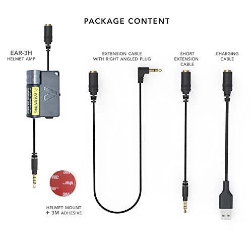 EAR3 Helmet AmpHelmet mount with 3m adhesive stickerBuilt-in rechargeable lithium batteryExtension cable with right angled plug (long – 10 inches)Extension cable (short – 5 inches)3.5mm to USB charging cable