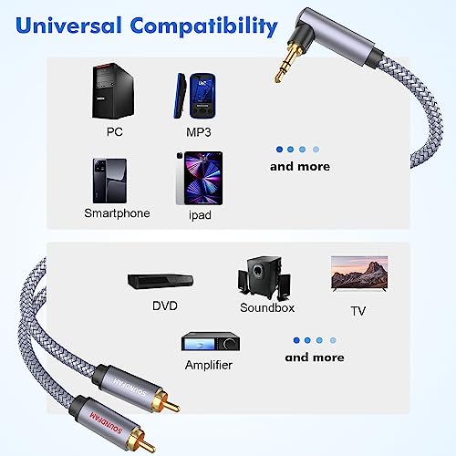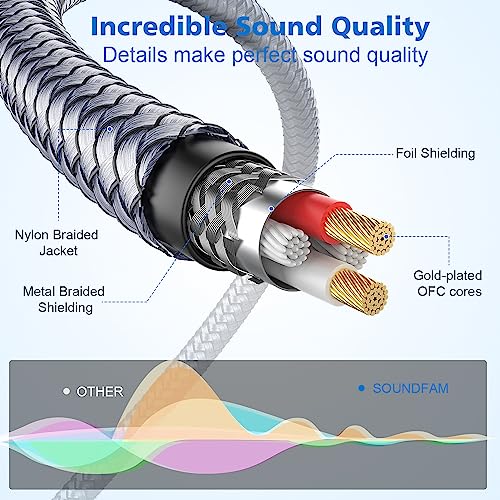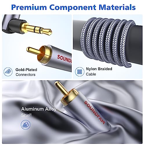 SOUNDFAM RCA to 3.5mm Aux cables use oxygen-free copper and multiple shields to provide premium stereo sound and protection against radio frequency interference (RFI) and electromagnetic interference (EMI).