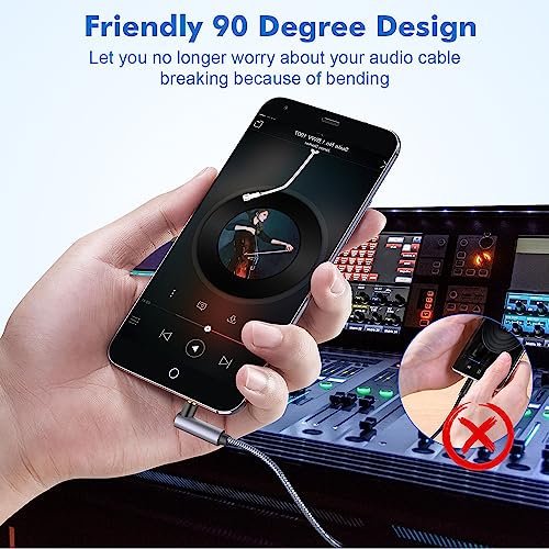 It features bi-directional audio transfer. the RCA to headphone jack cable can transfer music between Aux devices and 2RCA (red and white) devices. the 2RCA to 3.5mm jack cable lets you enjoy a great stereo sound experience.This RCA to 3.5mm wire is built for permanent use. 10,000+ bend life and cotton nylon braid make the 3.5 to RCA audio cable improve durability and flexibility. SOUNDFAM AUX to 2RCA audio cable can withstand any twisting, pulling and tangling.90 degree aux plug desngl:The 90 degree auxiliary plug of this 3.5mm to 2RCA cable is designed to allow you to easily plug into your phone’s headphone jack, it also allows you to connect to tight spaces and hard to reach places where a normal right angle connector would not work.