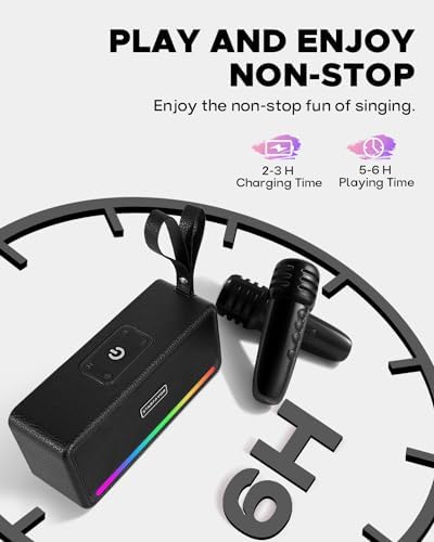 [Colorful Lights and Long-lasting Battery] Take your karaoke performance to the next level with five dynamic lighting effects. Perfect for kids’ karaoke parties, the speaker boasts a 1500mAh battery for 5-6 hours of continuous music playback, ensuring a lasting and visually captivating experience.