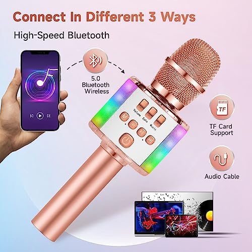 Texpot Karaoke Microphone for Kids, Wireless Bluetooth Microphone with LED Lights, Portable Handheld Mic Speaker Kids Microphones for Singing, Gifts Toys for 4 5 6 7 Year Old Girls Boys (Rose Gold)