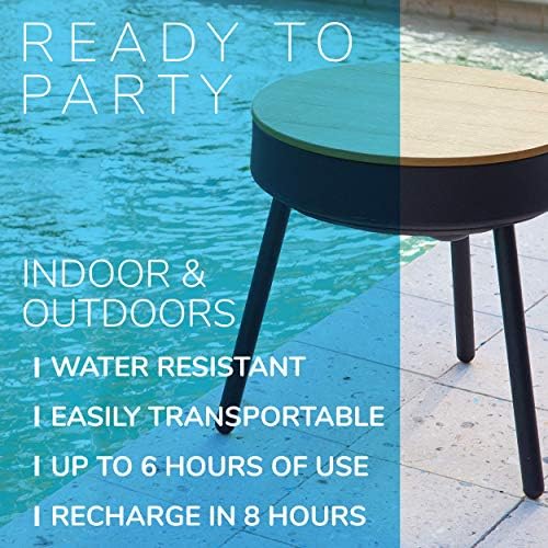 This sleek, stylish Smart End Table from uuffoo will energize your leisure time with its Bluetooth speaker capabilities and colorful LED mood lighting. Simply connect your smartphone to the table with Bluetooth to play your favorite music. You can also play music using devices without Bluetooth using the auxiliary port. The table features two 12W woofer speakers and two 8W tweeter speakers that produce clear, rich audio with a 360-degree stereo effect. These powerful speakers can fill your home or patio with sound for a party, or produce a quiet, soothing volume for when you are relaxing alone. The LED light on the bottom of the table has 7 vibrant color options; you can select between individual colors, or slow or fast changing colors to suit the atmosphere and set the mood. The durable PE plastic housing and wood-plastic (same as simulated wood deck material) construction of the table will not scratch or stain; easy to clean. You can place this table indoors or outdoors even near a pool without worry; it has an IP44 waterproof rating that allows it to withstand splashing water for 10 minutes without harm. You can also charge your phone wirelessly by setting it on the charging icon on the table surface. The wireless charging feature works best without a protective phone case. The table charges with the included USB cable; the long lasting built-in 880mAh lithium battery takes 8 hours to charge completely and functions for 6 hours at 60 percent volume. Just the right size to fit next to your couch or lounge chair, the table measures 19.68 inches in diameter and 20.67 inches tall to keep your phone and beverages conveniently close. The uuffoo Smart End Table allows music lovers to customize the feel of their home and patio by selecting their music and lighting modes.